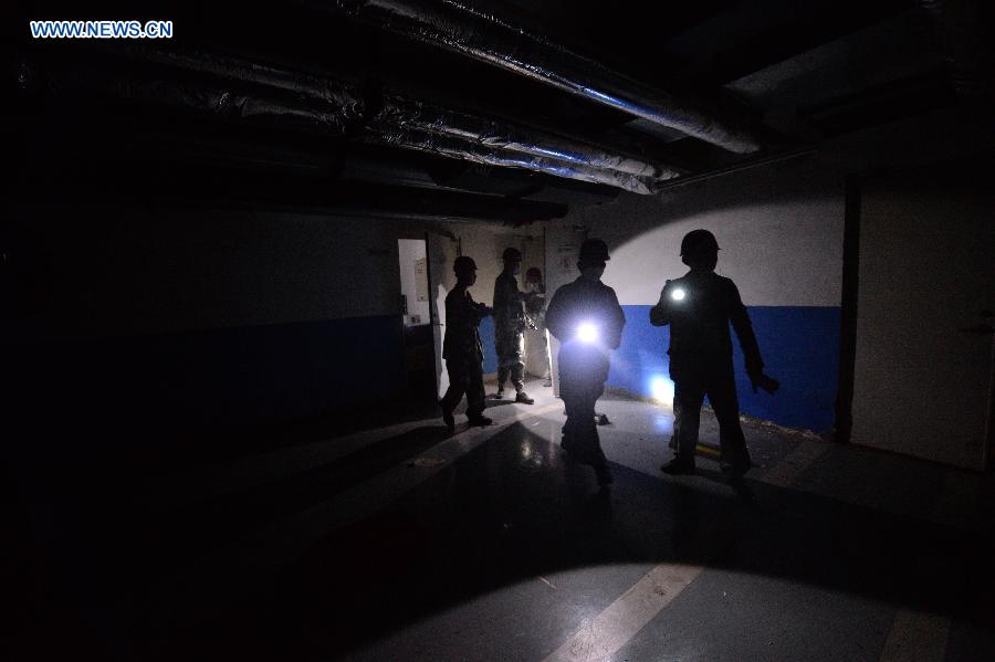 | Militia check the underground space of a residential area near the warehouse explosion site in north China's Tianjin, Aug. 18, 2015. (Xinhua/Yin Dongxun) |
