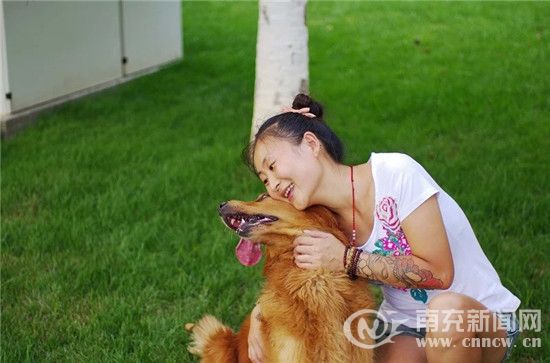 | Yue Xiaohong poses for a photo with the dog she trains. (cnncw.cn/ Xu Siqian) |