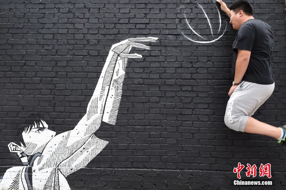 Graffiti enthusiasts paint on a 200-meter wall in Taiyuan, north China’s Shanxi province on Aug. 18, 2015. (CNS/Wu Junjie)