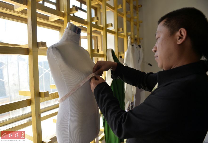 Tashi measures while designing the clothing. (Xinhua/Liu Dongjun)