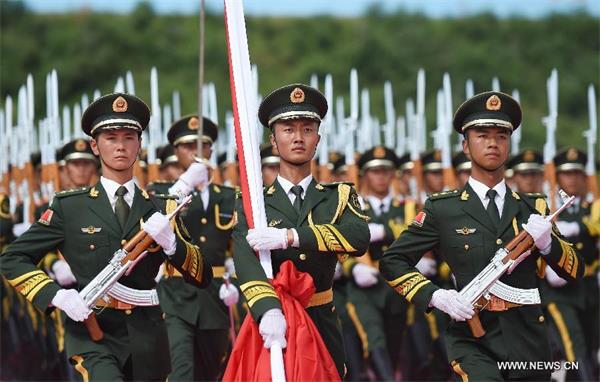 Soldiers take part in a training at a training base in Beijing, capital of China, Aug. 25, 2015. Soldiers who will escort Chinese national flag in the Sept. 3 military parade have been trained here as from June in uniforms. (File photo)
