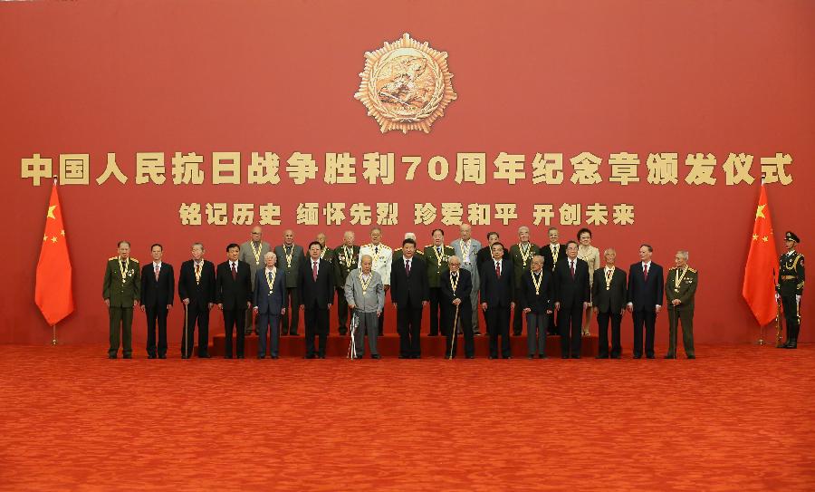 A medal awarding ceremony is held at the Great Hall of the People in Beijing, capital of China, Sept. 2, 2015. Chinese President Xi Jinping on Wednesday granted medals to 30 Chinese and foreign veterans and civilians who fought for China in the World War II. (Xinhua/Pang Xinglei)
