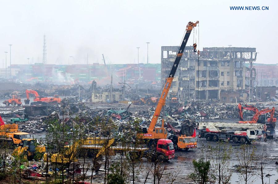 Rescuers clean up debris at the warehouse explosion site of Tianjin, north China, Aug. 31, 2015.