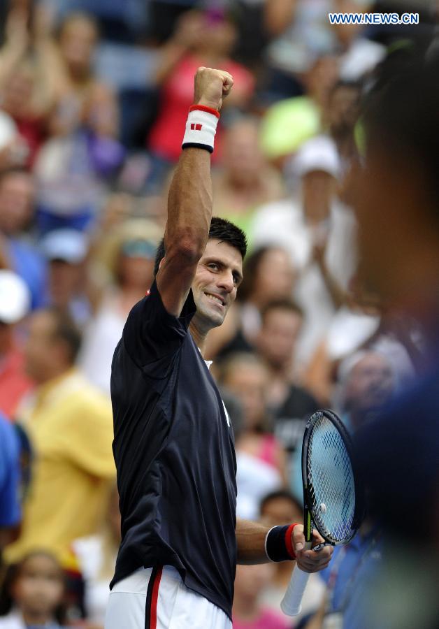Novak Djokovic of Serbia celebrates after winning the men's singles third round match against Andreas Seppi of Italy at the 2015 US Open in New York, the United States, Sept. 4, 2015. Novak Djokovic won 3-0 to enter the next round. (Xinhua/Wang Lei)