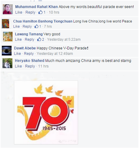 Foreign internet users and media also pay close attention to the grand V-Day parade and congratulate China on the event. Many netizens think China made important contribution to the victory of World War II and plays an important role in safeguarding world peace. The military parade is a wise move for China to take the history as a mirror to guide the future. As a major world economic and military power, China has set a good example for Asia and the rest of world in maintaining regional and global peace and stability.