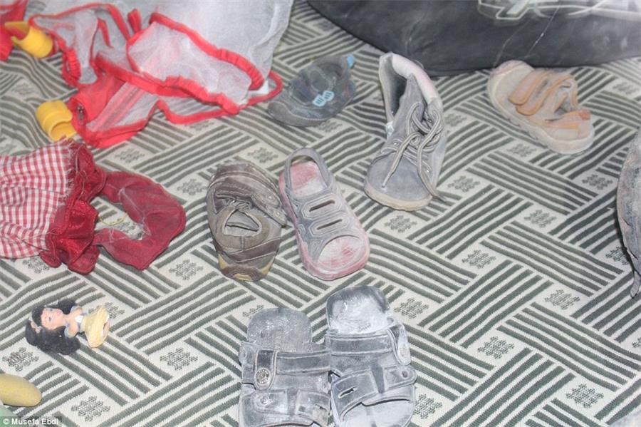 Heart-breaking: Children's dust-covered shoes are pictured in the home where Aylan, Galip, Rehan and Abdullah once lived in Kobane