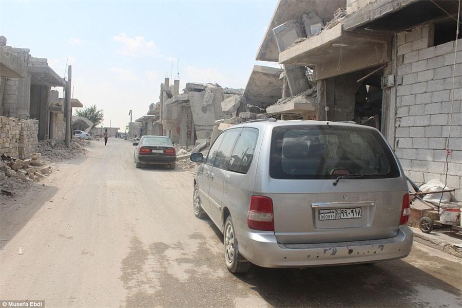 Razed to the ground: Many of the buildings in the war-torn town in Syria have been abandoned after they were damaged during shelling
