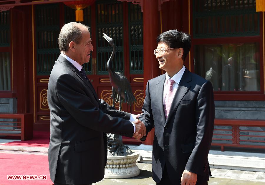 Meng Jianzhu (R), a member of the Political Bureau of the Central Committee of the Communist Party of China (CPC) and head of the Commission for Political and Legal Affairs of the CPC Central Committee, meets with a delegation of British 48 Group Club led by its Chairman Stephen Perry in Beijing, capital of China, Sept. 7. 2015. (Xinhua/Zhang Ling)