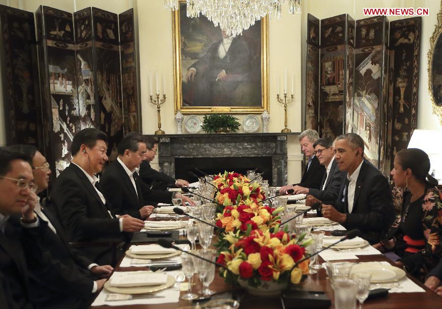 Chinese President Xi Jinping(3rd L) meets with U.S. President Barack Obama(2nd R) at the Blair House in Washington D.C., the United States, Sept. 24, 2015. (Xinhua/Lan Hongguang)