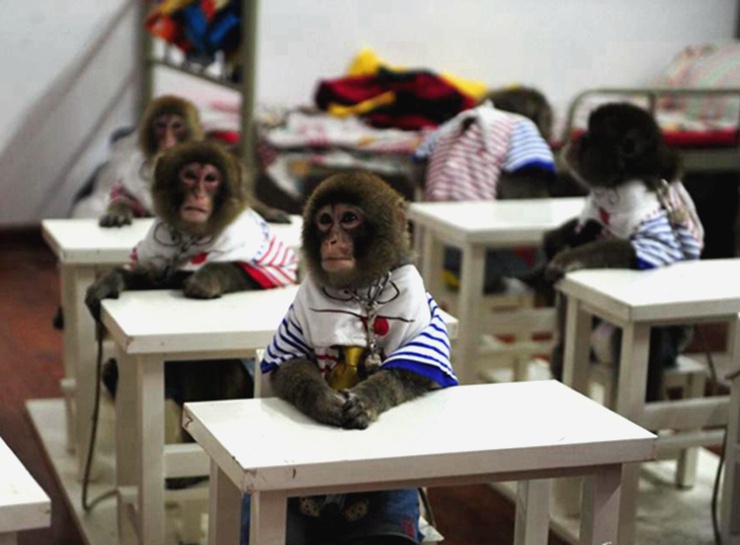 China’s first monkey school opens in Dongying, Shandong province on September 24, 2015. Thirty Japanese macaques, commonly known as snow monkeys learns shaking hands, salutes and counting numbers at the school. (Iqilu.com/Zhang Wei)