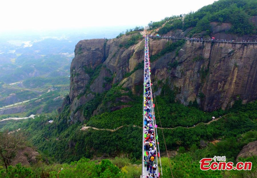 A photo taken on October 4, 2015 shows thousands of people on and near the all-glass bridge, which is located in Pingjiang County, in Central China's Hunan province. The all-glass bridge is suspended 180 meters over a canyon. It received around 20,000 visitors on last Friday, the second day of China's current week-long National Day holiday. (Photo: Chinanews.com/Liu Hongqiang)