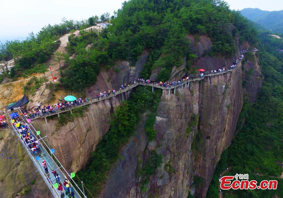 A photo taken on October 4, 2015 shows thousands of people on and near the all-glass bridge, which is located in Pingjiang County, in Central China's Hunan province. The all-glass bridge is suspended 180 meters over a canyon. It received around 20,000 visitors on last Friday, the second day of China's current week-long National Day holiday. (Photo: Chinanews.com/Liu Hongqiang)