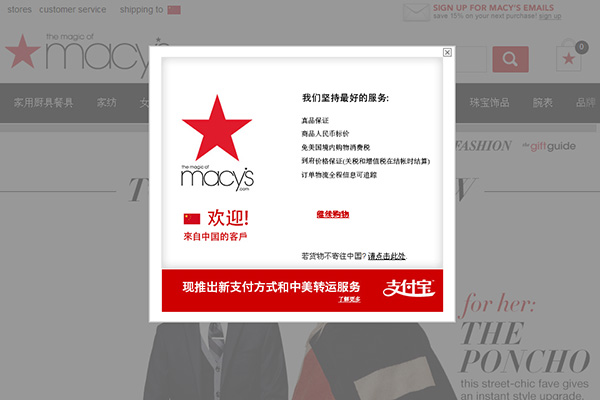 The homepage of US retailer Macy's has a pop-up in Chinese, saying all goods are priced in yuan and can be delivered to China. [Photo from Macy's website]