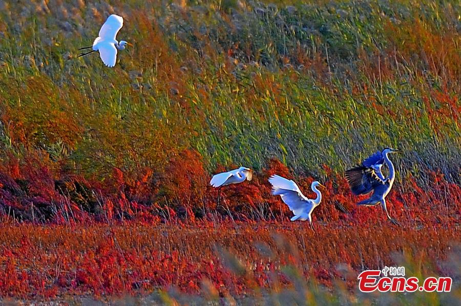 A large group of migratory birds temporarily take up residence in the Beidagang wetland nature reserve, a key stop on their migration paths, in north China's coastal city of Tianjin, Oct. 8, 2015. (Photo: China News Service/Tong Yu)