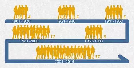 In fact, the prize has been awarded 14 times to female from 1901 to 1960, with the Curies taking up three places. This situation did not get better in the following 20 years with only five female got the prize. However, female scientists have played increasingly important role in science. A total of 11 female got the prize from 1981 to 2000. Furthermore, 14 female won the prize from 2000 to 2014.