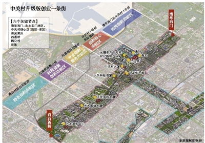 According to the plan, the area will cover key universities such as Peking and Tsinghua, electronics stores and shopping centers. A total of 36 office buildings are on both sides of the street with a floorage of 1.7 million square meters, which houses more than 6,000 companies.