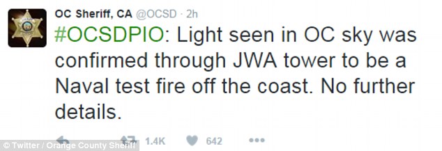 NOT aliens: 'Light seen in OC sky was confirmed through JWA tower to be a Naval test fire off the coast. No further details,' tweeted the Orange County Sheriff's department late on Saturday evening.
