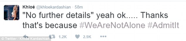 '"No further details" yeah ok..... Thanks that's because #WeAreNotAlone #AdmitIt,' Khloe tweeted.