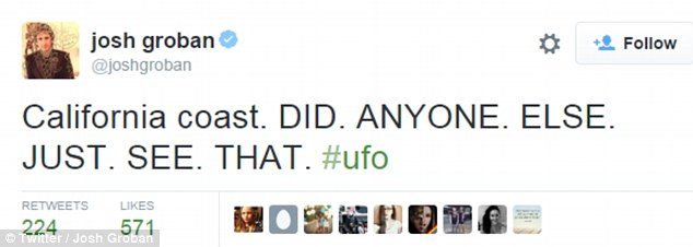 'California coast. DID. ANYONE. ELSE. JUST. SEE. THAT. #ufo,' Josh Groban tweeted.