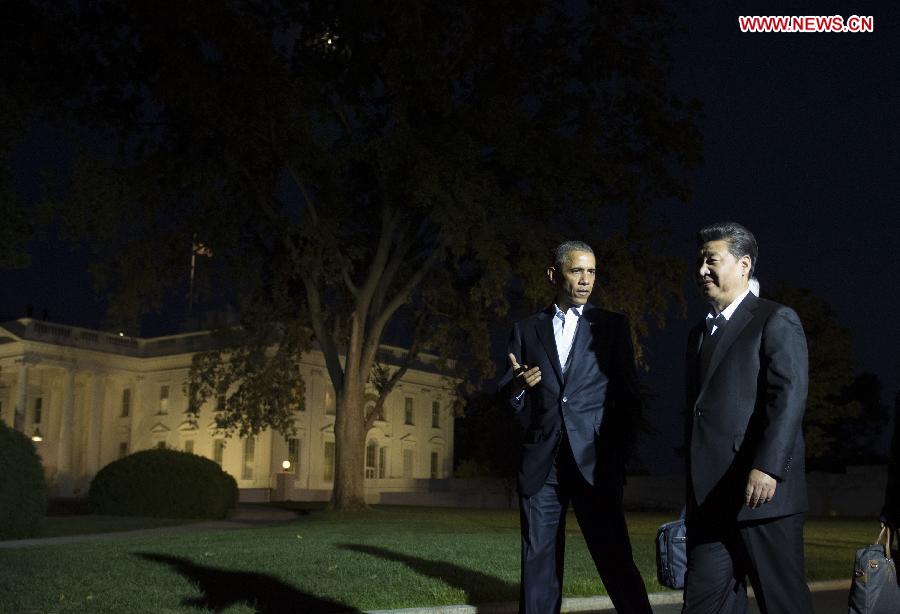 Chinese President Xi Jinping (R) and his U.S. counterpart Barack Obama walk to a private dinner near the White House in Washington D.C., capital of the United States, Sept. 24, 2015. (Xinhua/Li Xueren)