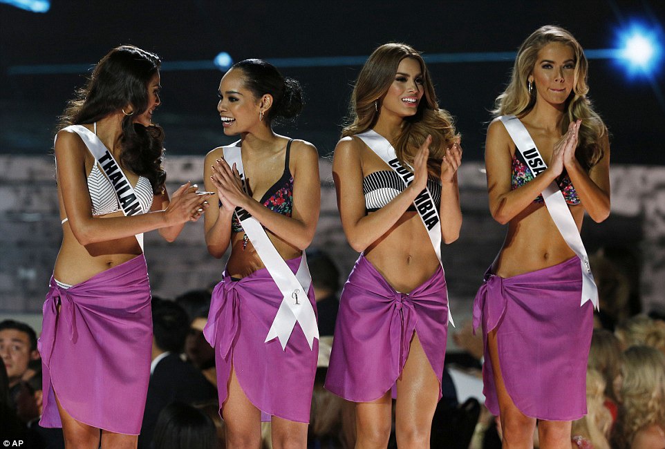 From left, Miss Thailand Aniporn Chalermburanawong, Miss Japan Ariana Miyamoto, Gutierrez and Jordan during the swimsuit round