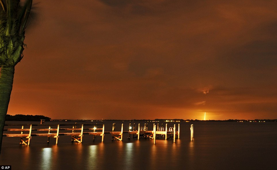 The SpaceX Falcon 9 launch appears in the distance from the back of River Rocks dockside restaurant along the Indian River, south of Rockledge, Florida