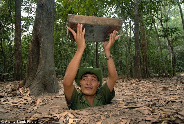 A guide emerges from a Cu Chi tunnel, built by the Viet Cong and famous for its tiny dimensions