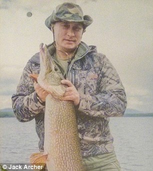 Fishing: Putin was accused of exaggerating the size and weight of the pike, which he said he caught in Siberia in 2013 (pictured left). The president is back in khaki (at least on his bottom half) and fishing in June