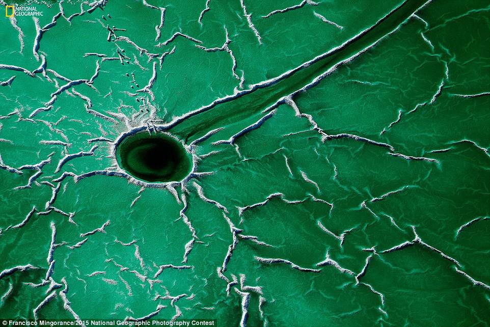 Francisco Mingorance. On the occasion of the preparation of a report on Ríotinto from the air, I decided to include phosphogypsum ponds located in the marshes of red and whose radioactive discharges has destroyed part of the marsh. As an environmental photojournalist had to tell this story and report it but had to do with an image that by itself attract attention of the viewer. I discovered this on a low-flying training that caught my attention for its resemblance to the impact of an asteroid on its green waters