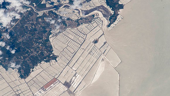 A grid pattern of fish farms on the coast of northeast China’s Liaoning province. The fish-farm basins have been built out from the dark-toned, wooded coast to a distance of nearly 6 km. (Photo/NASA)