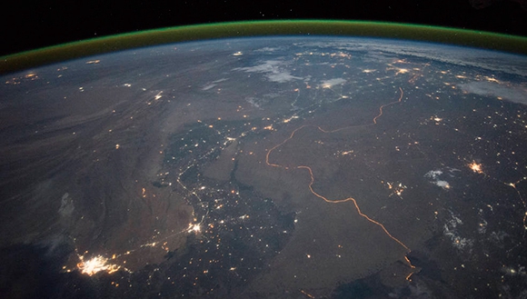 Photo presents the nighttime panorama looking north across Pakistan’s Indus River valley, one of the few places on Earth where an international boundary can be seen at night. (Photo/NASA)
