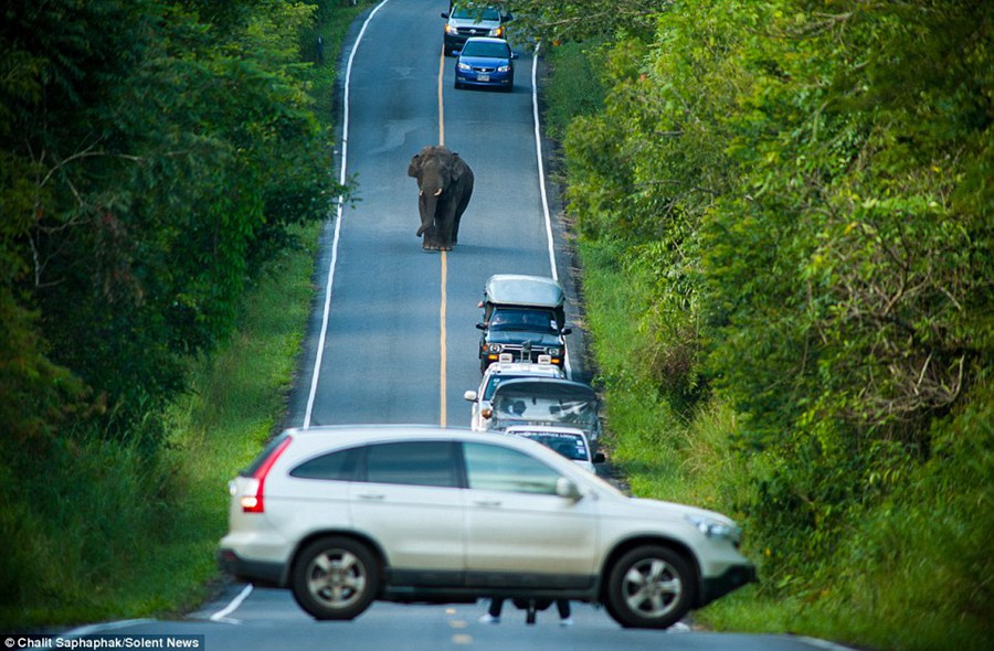 The male Asian elephant held up vehicles for around an hour as he made his way along the long road in Khao Yai National Park, in Thailand.