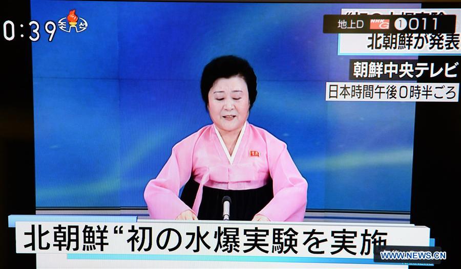 Photo taken on Jan. 6, 2016 in Tokyo, Japan shows a TV hostess of the Democratic People's Republic of Korea (DPRK) reads news during the broadcast. The Democratic People's Republic of Korea (DPRK) announced Wednesday that it has successfully carried out its first hydrogen bomb test. (Xinhua/Ma Ping)