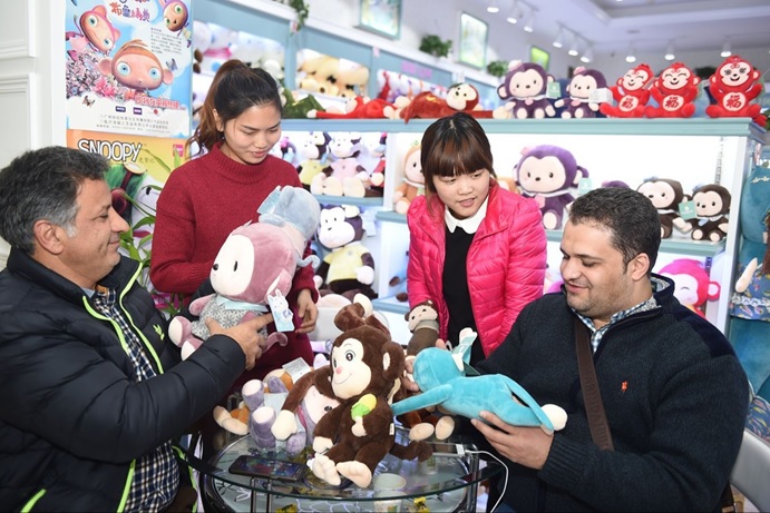 An Iranian customer purchases stuffed monkey toys in Zhejiang Province, China on December 31, 2015. (Photo: Xinhua)