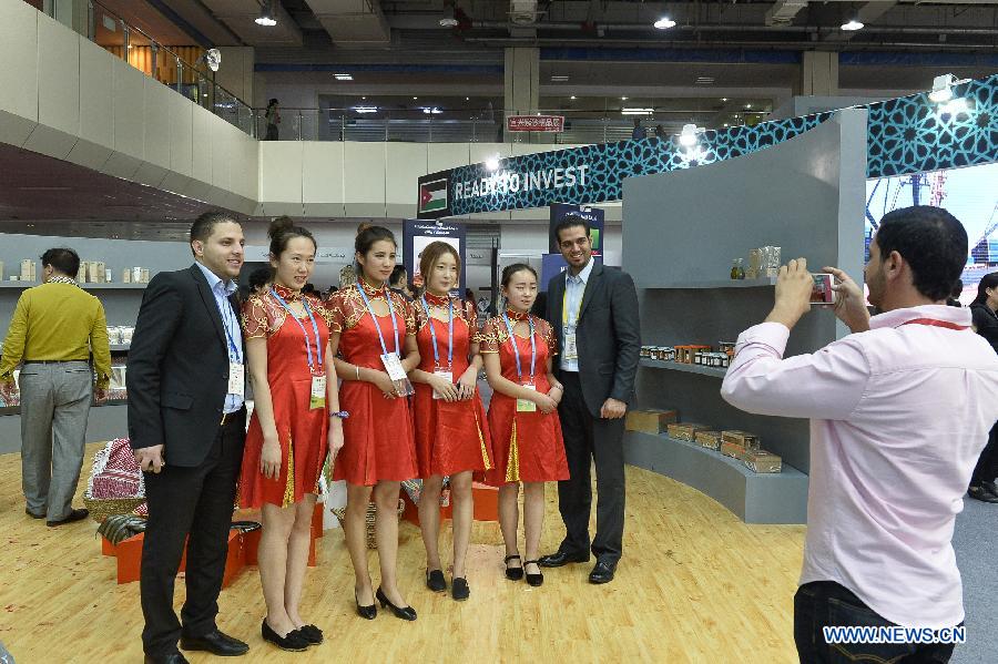 Businessmen from Jordan pose for a group photo with volunteers at the China-Arab States Expo 2015 in Yinchuan, capital of northwest China's Ningxia Hui Autonomous Region, Sept. 12, 2015. The second China-Arab States Expo, a platform to promote ties between China and the Middle East countries, kicked off on Thursday. (Xinhua/Peng Zhaozhi)