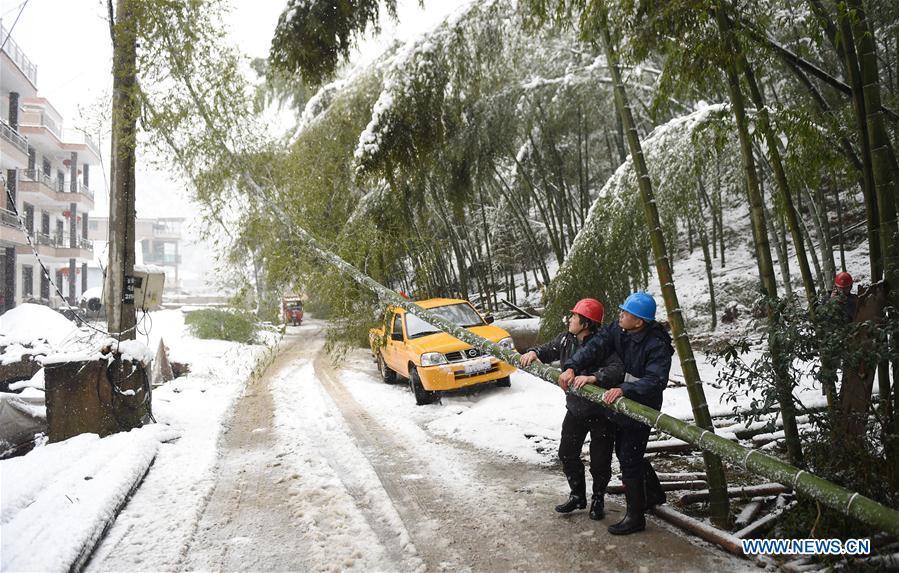 Electricians of local power grid remove a moso bamboo to restore power supply in Xiaoshan district of Hangzhou, capital of east China's Zhejiang Province, on January 21, 2016. China's National Meteorological Center (NMC) announced a warning Thursday morning for snowstorms in southern China. [Photo: Xinhua/Huang Zongzhi]