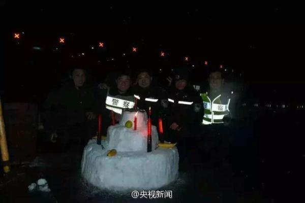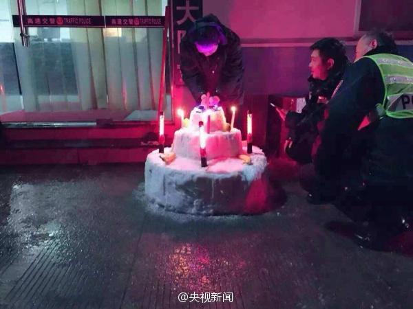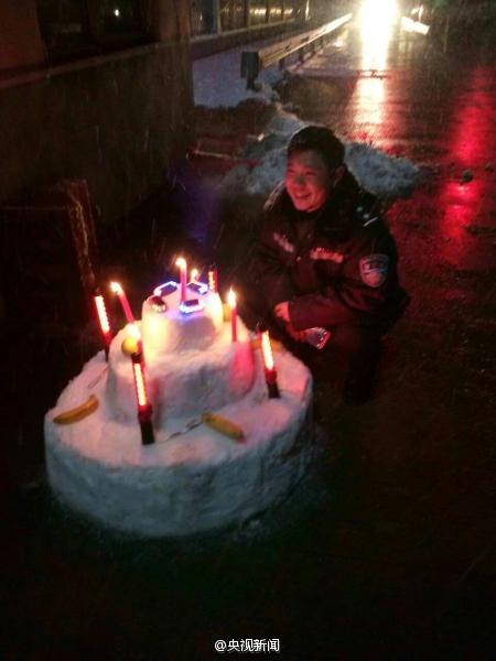 Officer Lin Qunhui spent his birthday directing traffic, after heavy snow swept many parts of east China, including the area where he was on duty. His fellow officers used snow to make him a birthday cake, with traffic safety batons serving as "candles".
