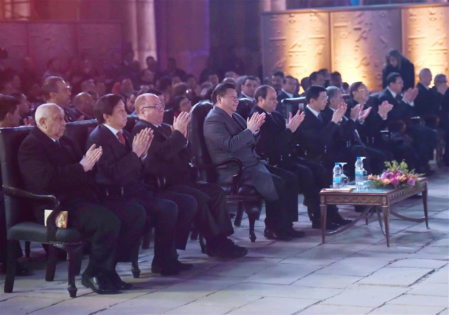 LUXOR, Jan. 22, 2016 (Xinhua) -- Chinese President Xi Jinping(4th L) and Egyptian President Abdel-Fattah al-Sisi (5th L) attend the celebration marking the 60th anniversary of the establishment of diplomatic ties between the two nations and the opening ceremony of the Sino-Egyptian Culture Year in 2016 at the Luxor Temple in Luxor, Egypt, Jan. 21, 2016. (Xinhua/Zhang Duo)