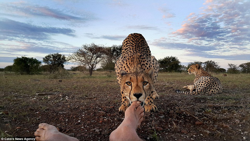 This is the terrifying moment a wild cheetah approached a daring photographer in an African game reserve - before starting to lick his toes.