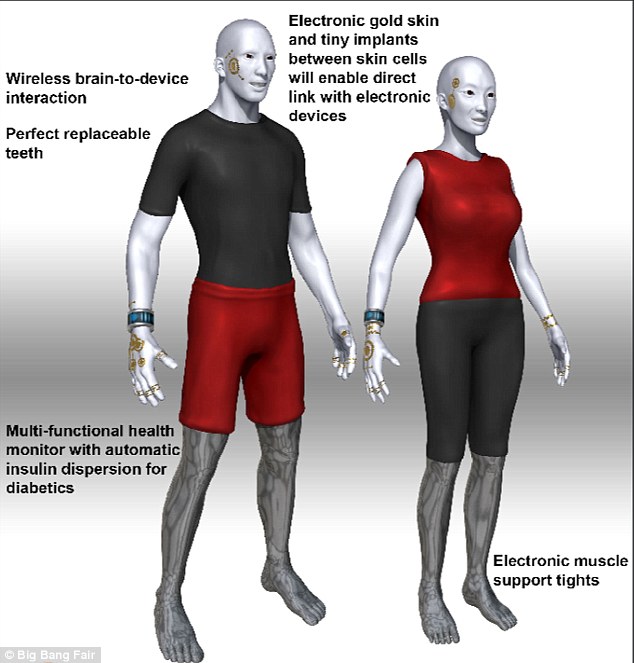 Research from academics and experts, collated by Dr Pearson for The Big Bang Fair, suggests humans will be able to directly communicate with electronics and we could clone teeth, fix surfaces and edit genes to make them self-replace (illustrated above)