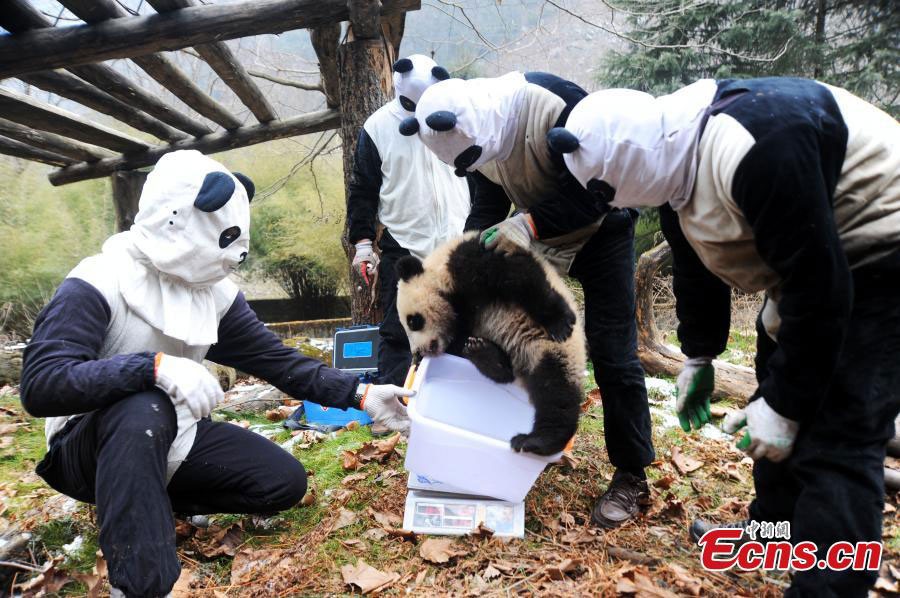 Staffs work at the Hetaoping base of the China Conservation and Research Center for the Giant Panda at the Wolong Nature Reserve in Southwest China’s Sichuan Province. Three panda cubs born in 2015 will be trained at the base before returning to the wild. [Photo: Chinanews.com/Qiu Yu]