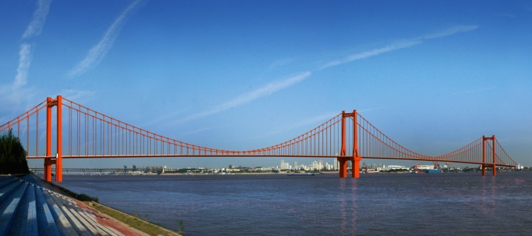 The Yingwuzhou Bridge over the Yangtze River. It is a highway bridge in Wuhan, central China's Hubei province. It is one of the longest suspension bridges in the world with two consecutive 850 m (2,790 ft) spans.