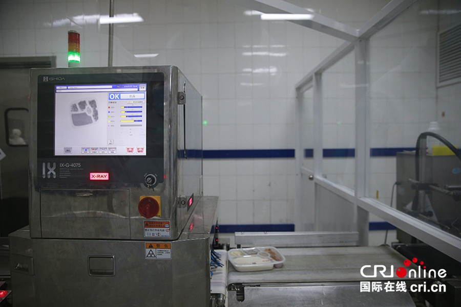 All the packed box lunches have to pass metal detector and X-ray detector before they can be encased. (Photo/Cri.cn)