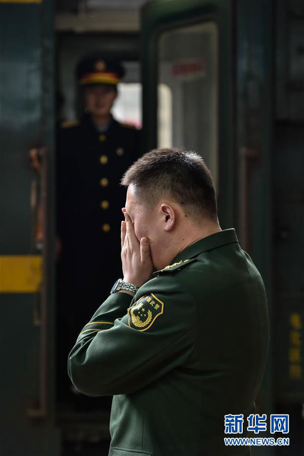 Pan holds back tears while watching his wife's train depart a station in south China's Guangdong Province on Feb. 3, 2016. [Photo: Xinhua]