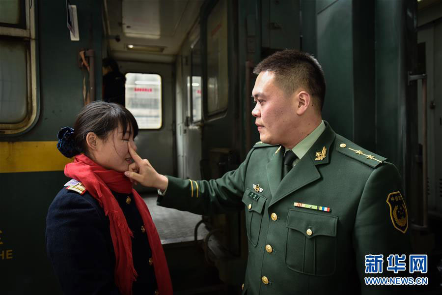 A Chinese newlywed couple, who married in January this year, spends their honeymoon for about 30 minutes before saying goodbye at a train station in south China's Guangdong Province on Feb. 3, 2016. The husband Pan Ding, a Chinese solider and his wife Lei Yun, a train attendant, had to go back at work, helping serve the millions of people heading home for family reunion during the peak travel time ahead of Chinese Lunar New Year. [Photo: Xinhua]