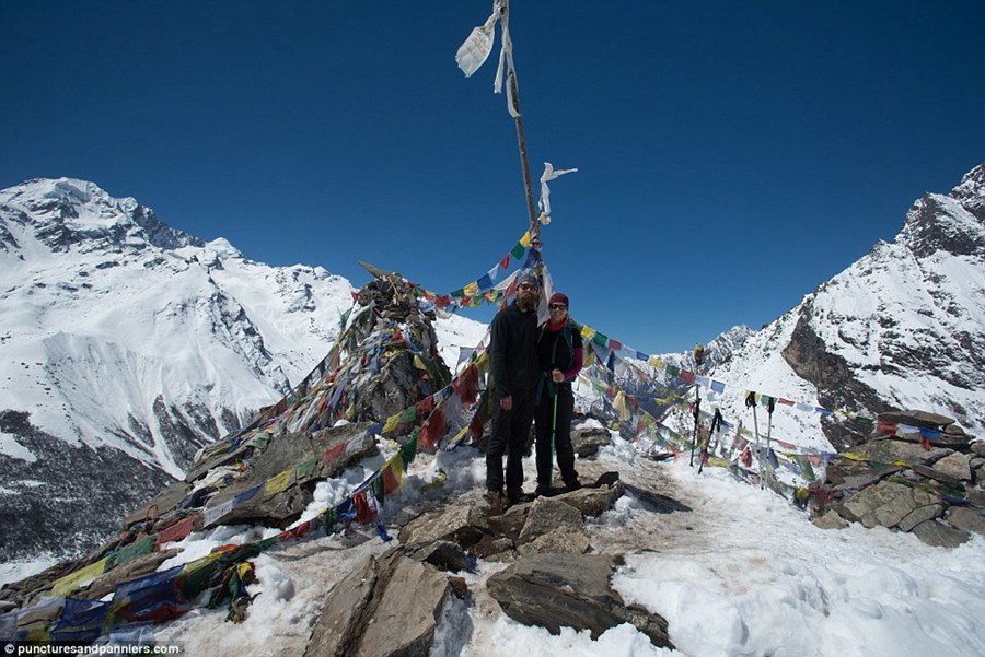 In Nepal, the two took a break from their bikes to hike the snowy Himalayas and posed for a snap at this mini summit