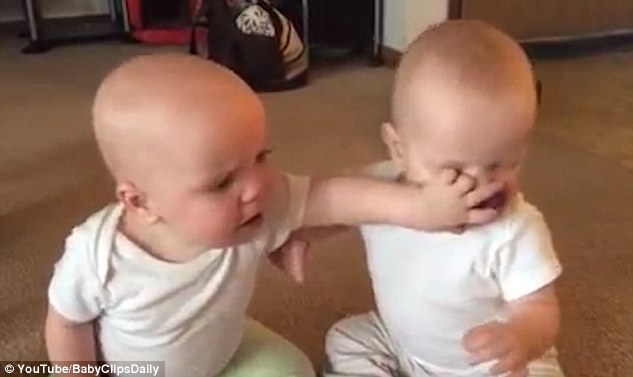 The feud appears to be settled when the baby wearing the green trousers realises that she can avoid the grasp of her sister if she turns her head to the side.