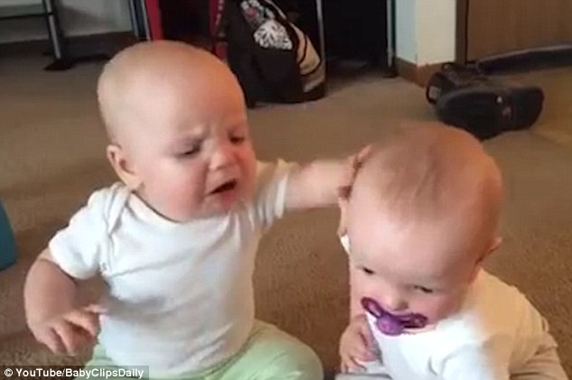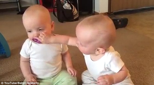 Twin babies have proved that you're never too young for a spot of sibling rivalry as they squabble over a dummy in a cute video.