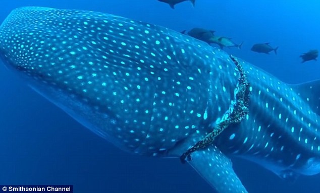 The whale shark was swimming in waters off Socorro Island, near the Mexican coast, with the rope tangled round its body