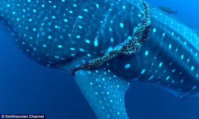The rope was tugging into the whale shark's body - fishing is one of the biggest risks faced by the giant fish